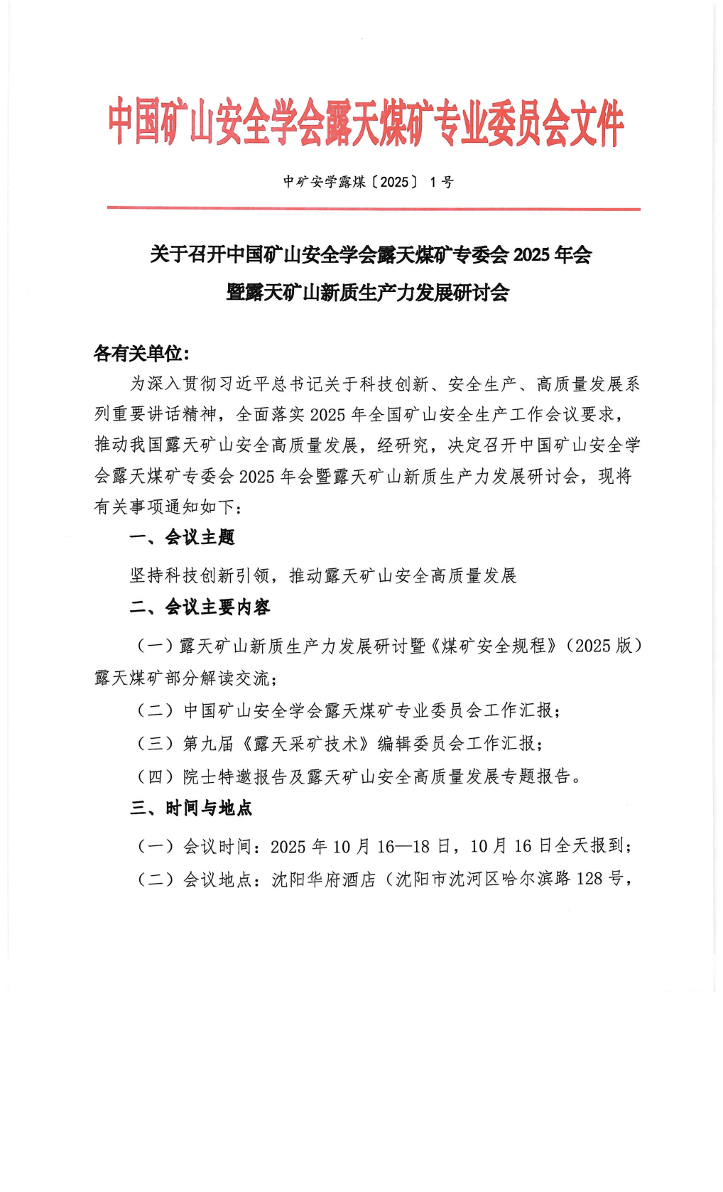 关于召开中国矿山安全学会露天煤矿专委会2025年会暨露天矿山新质生产力发展研讨会